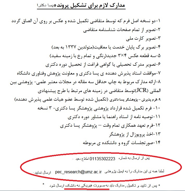 مدارک لازم برای پسادکتری دانشگاه مازندران