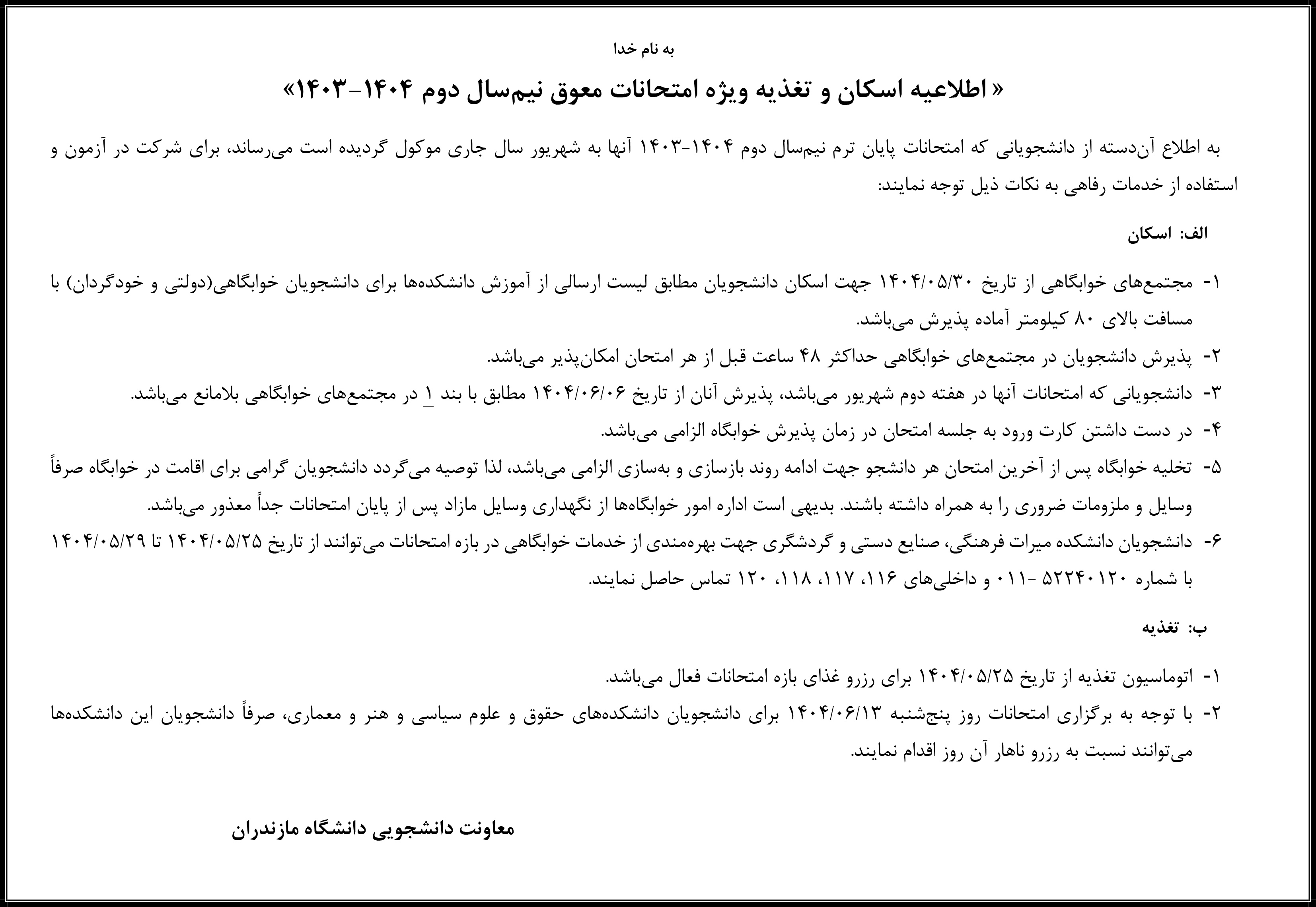 اطلاعیه اسکان و تغذیه ویژه امتحانات معوق نیمسال دوم 1404 - 1403 - دانشگاه مازندران