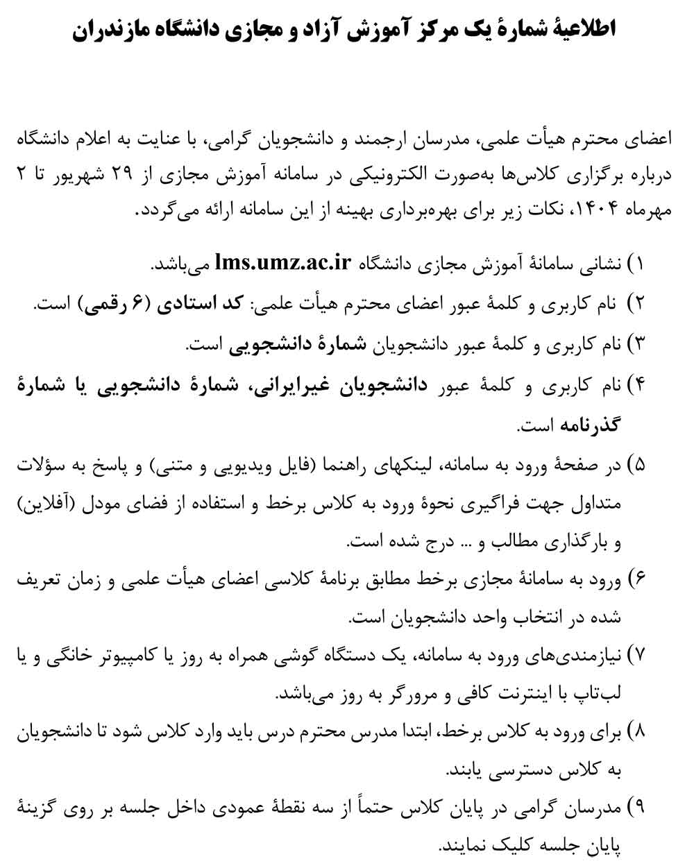 اطلاعیة شماره یک مرکز آموزش آزاد و مجازی دانشگاه مازندران - دانشگاه مازندران