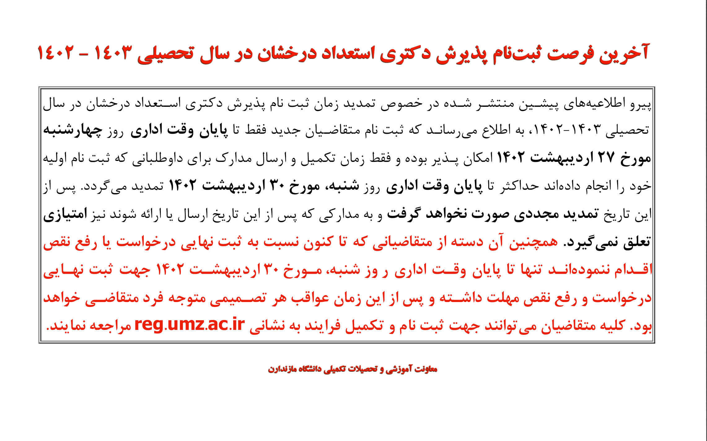 آخرین فرصت ثبتنام پذیرش دکتری استعداد درخشان در سال تحصیلی 1403 - 1402 - دانشگاه مازندران