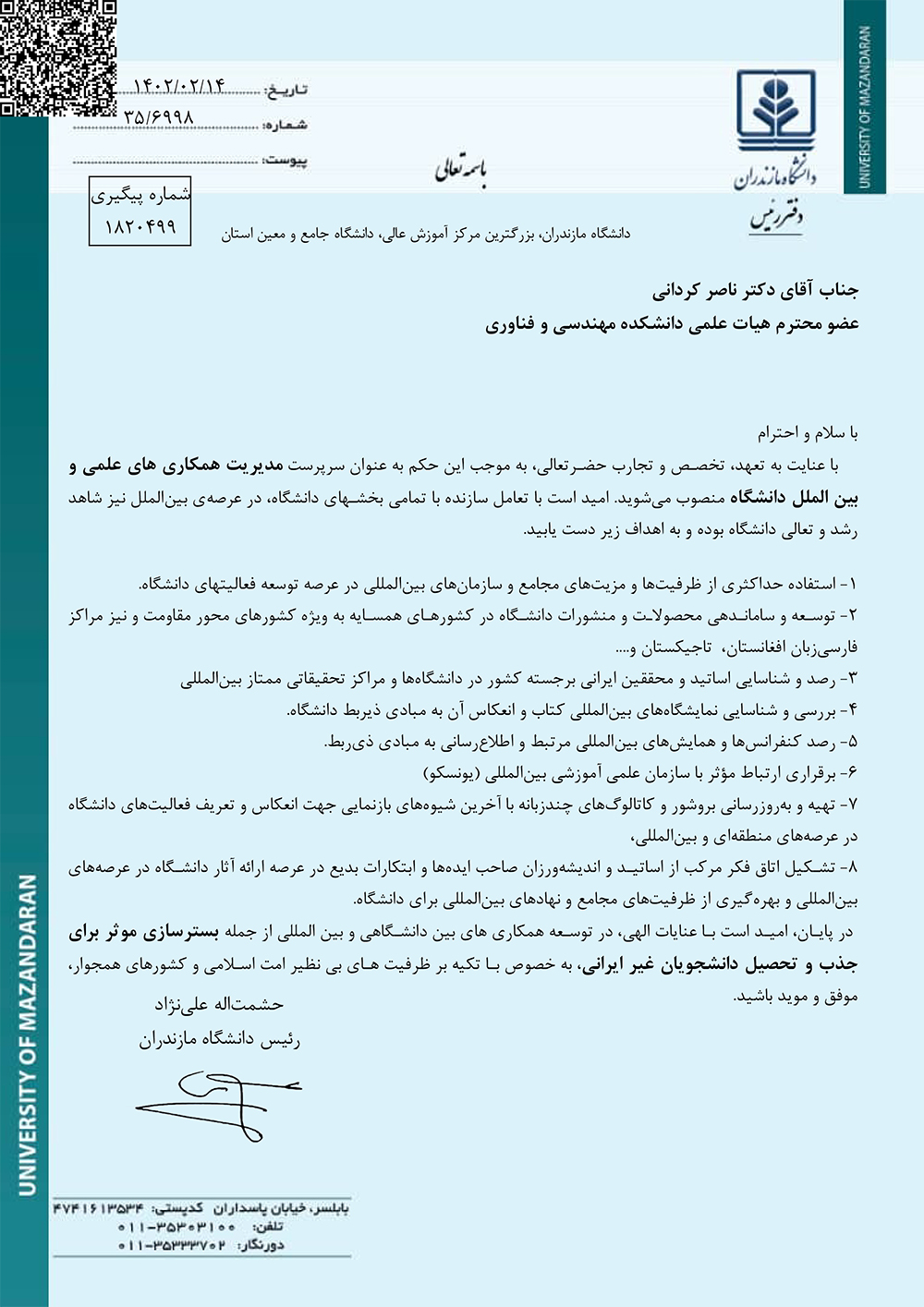 سرپرست مدیریت دفتر همکاریهای علمی بینالملل دانشگاه مازندران منصوب شد - دانشگاه مازندران
